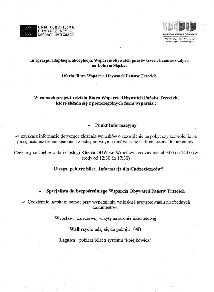 Oferta Biura Wsparcia Obywateli Państw Trzecich. BEZPŁATNE porady i pomoc w języku polskim, rosyjskim, ukraińskim i angielskim.