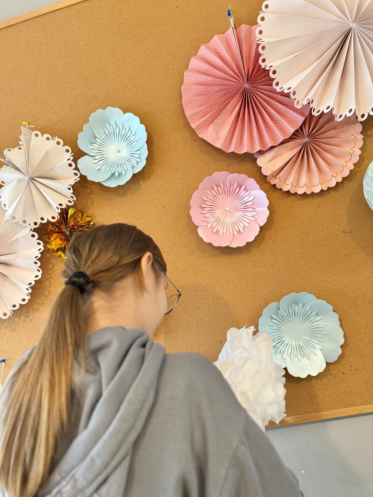 To jednak nie koniec twórczej zabawy! W drugiej części spotkania podopieczni wspólnie udekorowali tablicę korkową – powstały kolorowe papierowe kwiaty, zawisły rozety i pompony, a całość nabrała prawdziwie bajkowego klimatu.