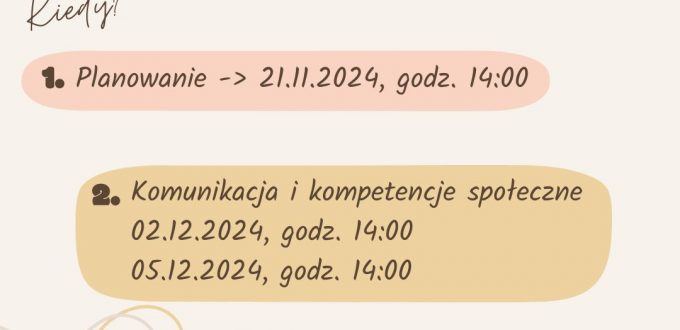 W dniach 24 i 29 października 2024 r. odbyły się warsztaty dla osób usamodzielniających się. Poruszona została tematyka kompetencji osobistych oraz aktywnego poszukiwania pracy. Dziękujemy wszystkim uczestnikom za udział! Zapraszamy na kolejne warsztaty, które odbędą się w najbliższy czwartek (21 listopada) o godzinie 14:00. Dotyczyć one będą planowania oraz gospodarowania budżetem, czasem i innymi czynnościami […]