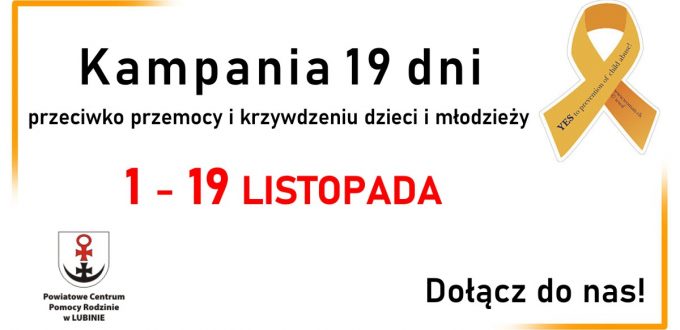 Powiatowe Centrum Pomocy Rodzinie w Lubinie uprzejmie informuje, iż przystąpiło do ogólnoświatowej kampanii pod hasłem „19 dni przeciwko przemocy i krzywdzeniu dzieci i młodzieży” prowadzonej w okresie od 1 listopada 2019 r. do 19 listopada 2019 r. W ramach Kampanii w siedzibie Powiatowego Centrum Pomocy Rodzinie uruchomiona zostanie „Strefa edukacyjna – Razem przeciwko przemocy”, w […]
